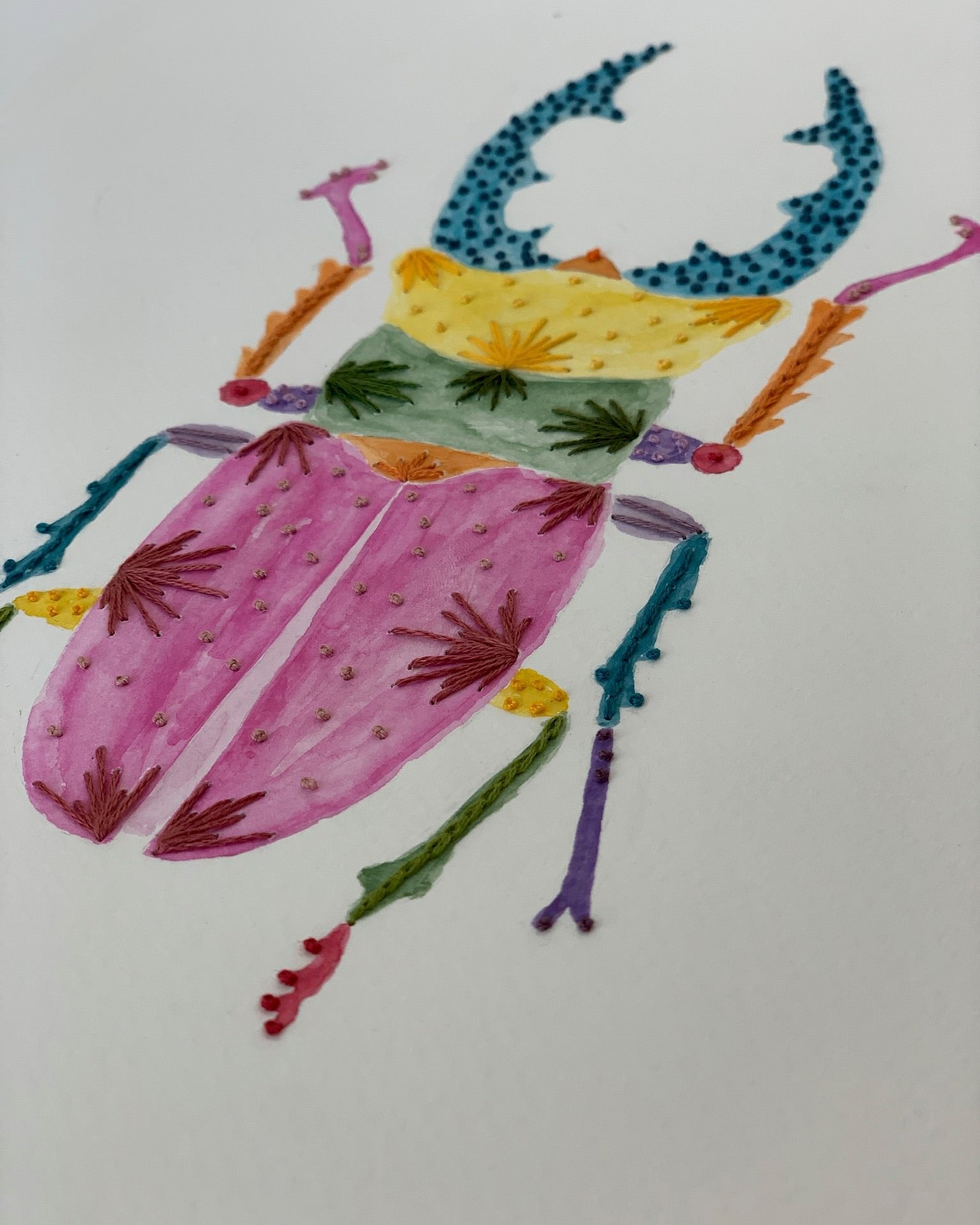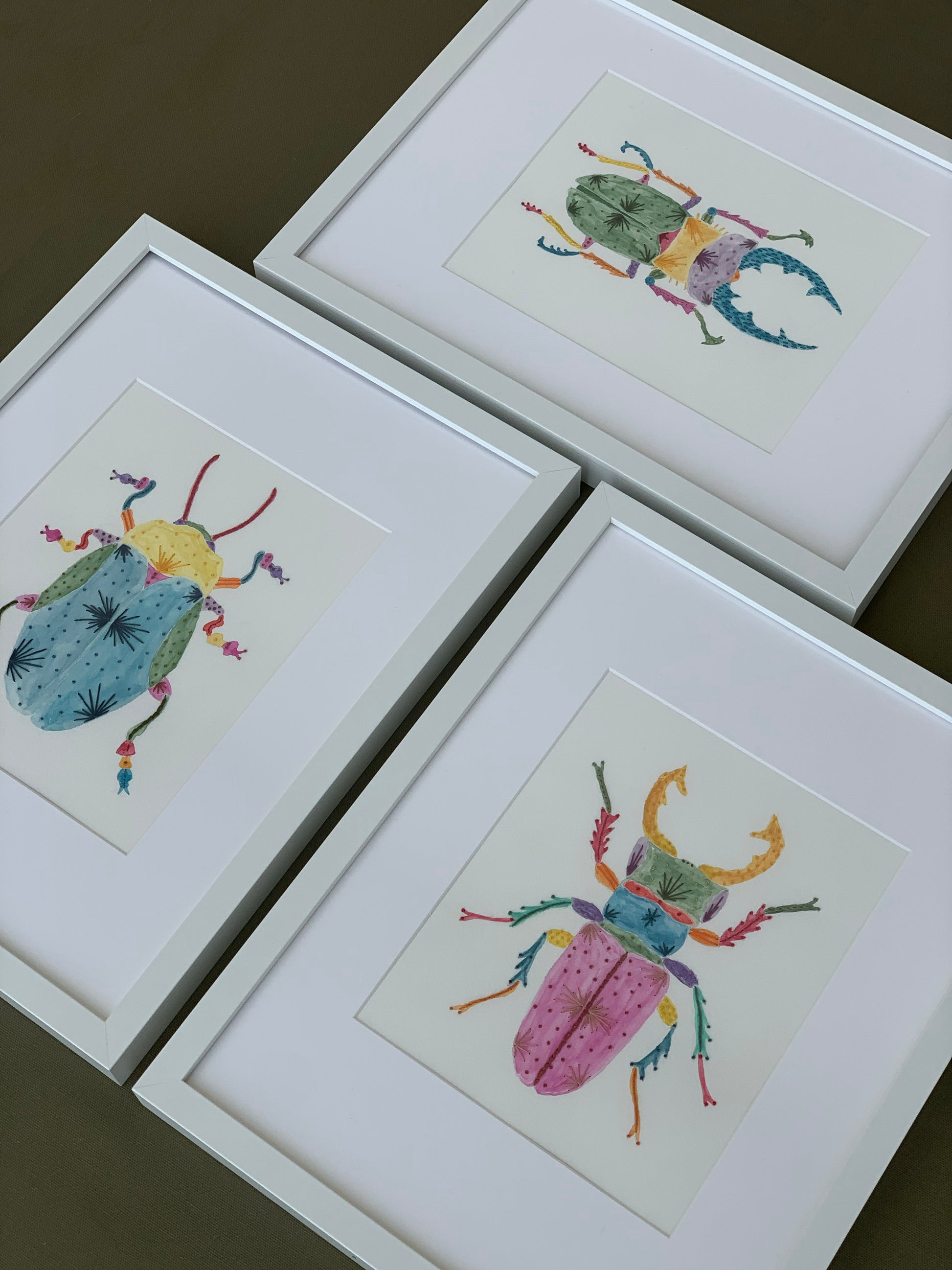 Set de 3 cuadros de escarabajos en acuarela y bordado sobre fabriano.